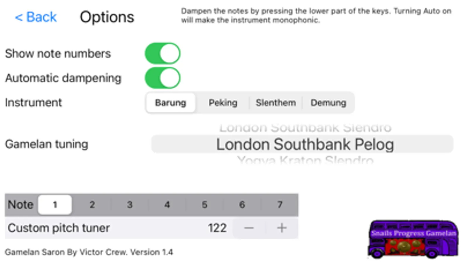 This is a simulator of the saron barung, peking, demung and slenthem Javanese gamelan balungan instruments. It is tuned in the slendro and pelog laras tuning system of several gamelans which can also be custom tuned and has Western diatonic C major and G major scales. It uses sound samples from the Snail's Progress Gamelan which was made by the great Javanese gong smith Pak Tentrem Sarwanto from Java.