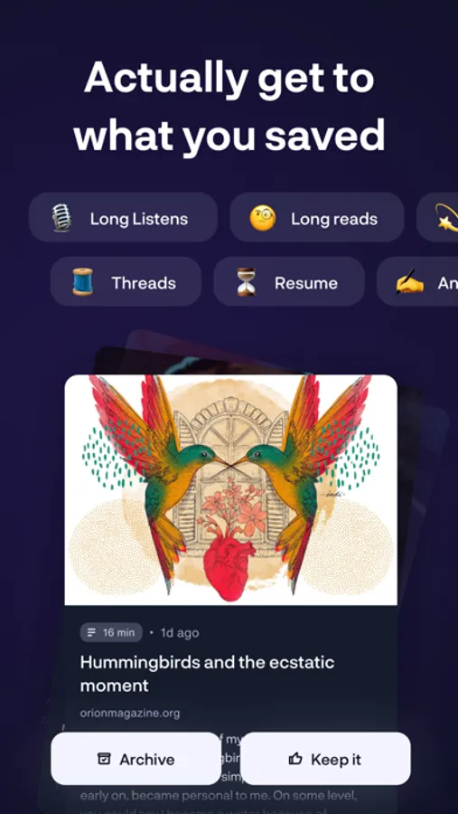 SAVE ANYTHING & GET TO IT LATER. Collect articles, podcasts, newsletters, tweets, threads, videos, images & documents in a single library. Then actually get to them with unique organizational tools & filters and focus on your content in a beautiful minimal reader.