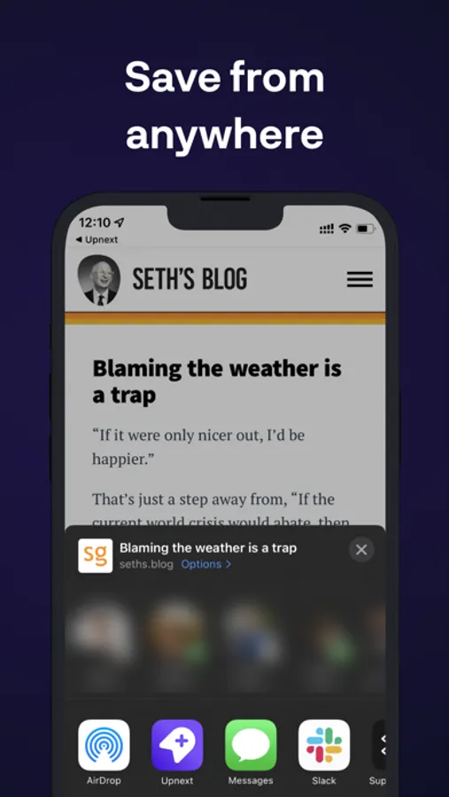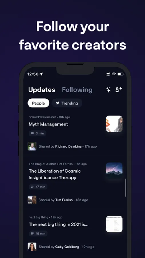 Get updates when your favorite creators and experts create or share content online. Connect your Twitter account and see the most shared content on your timeline. Import your saved content from Pocket, Instapaper, Raindrop and other tools. Sync with Readwise and others. More integrations coming soon.