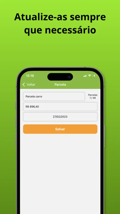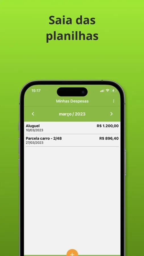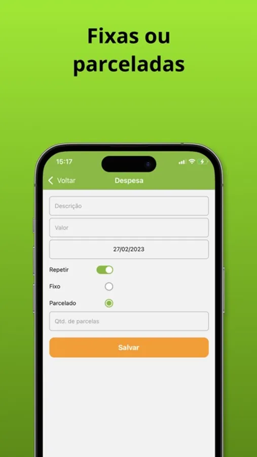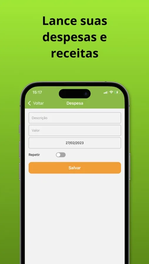 Expense screen - here is the expense record. Informing the description, value and expiration date. It is also possible to indicate if the expenditure repeats over the months of fixed form (every month) or installment (specific amount of months).