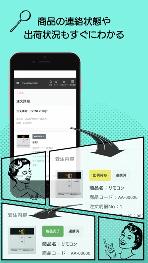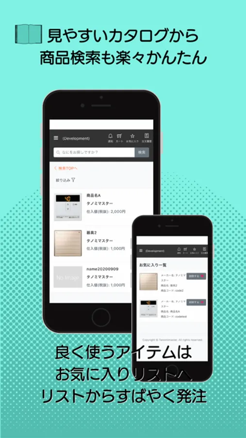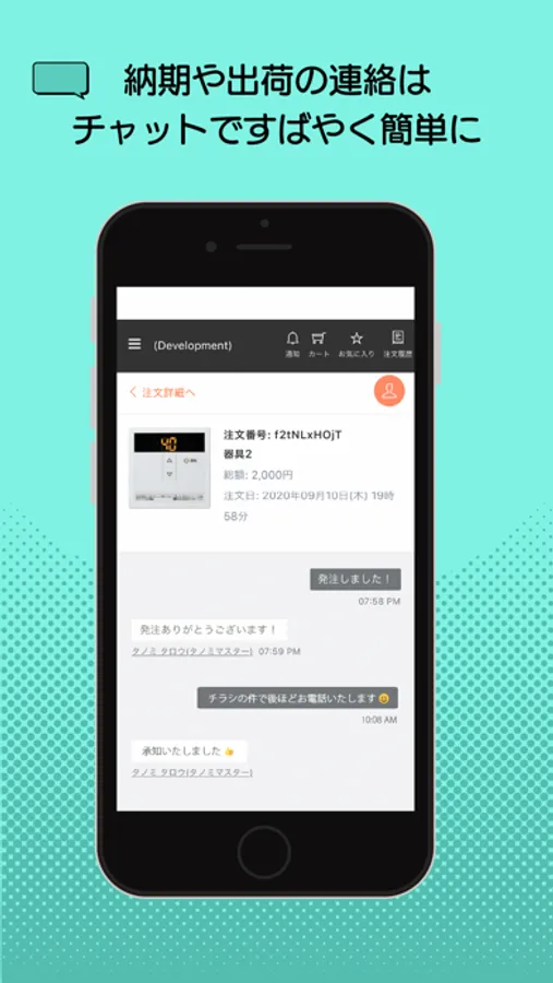 受発注に必要なデータをアプリ上に事前登録すれば、現場での受発注が可能になり、全ての受発注業務をアプリで完結できます。