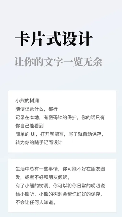 生活中总有一些事情,你可能不好在朋友圈发,或者不好和朋友倾诉。有了小熊的树洞,你可以将你日常的唠叨说给小熊听,小熊的树洞会帮你好好的保存,不会让任何人知道。