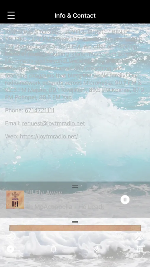 AWESOME STORIES, JOYFUL MUSIC, BIBLE TRUTH... JOY FM covers the islands of Guam at 91.9 FM and the CNMI at 89.9 FM. We offer an inspiring blend of music including inspiring A Capella and island music from across Micronesia and beyond! We also carry a wonderful selection of audio dramas and preaching and teaching programs that bless the whole family! Our radio network extends across Micronesia. 90.7 FM & 92.3 FM Majuro, 89.1 Kwajalein, 89.5 FM Kosrae, 87.9 FM Pohnpei, 88.5 FM Yap (Coming Soon)
