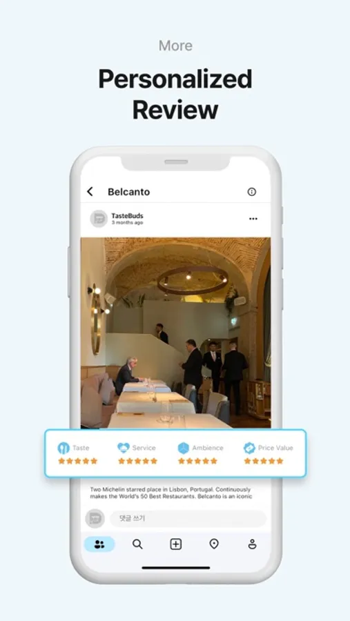 To help users find restaurants more efficiently, we have categorized restaurants by four key features: taste, mood, service, and price value. This will make it easier for you to search for the restaurants you want. Also by analyzing data of the restaurants you and your “TasteBuds” have liked or highly rated, we can give restaurant recommendations personalized to you using our in-app algorithm.
