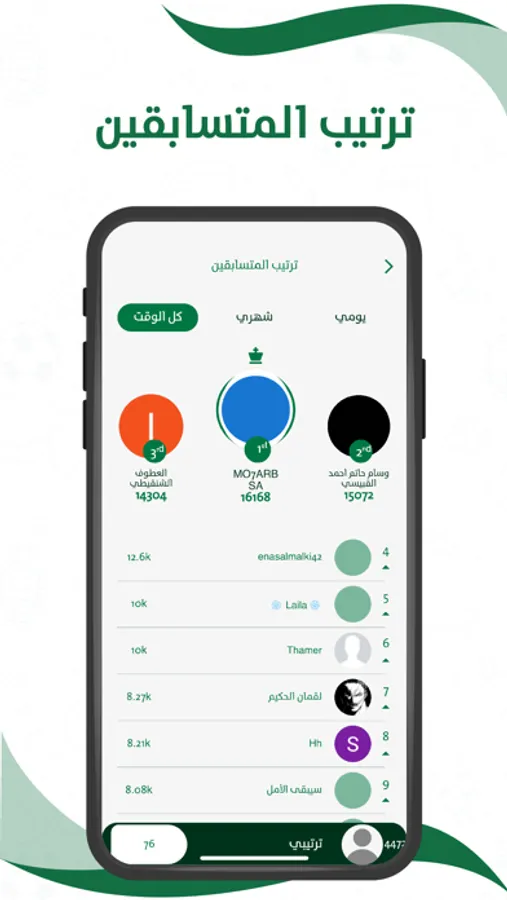 يقوم التطبيق بعرض أفضل المتسابقين يوميا وشهريا وكل الأوقات حسب أفضل النقاط.