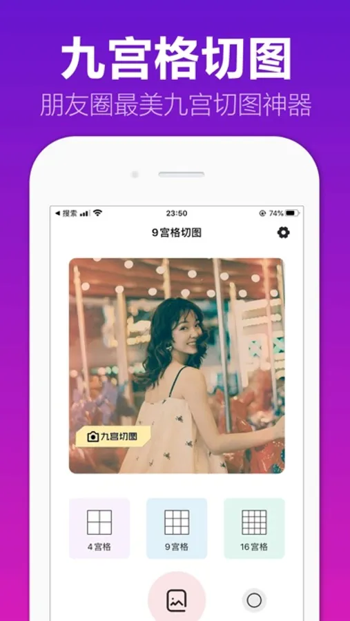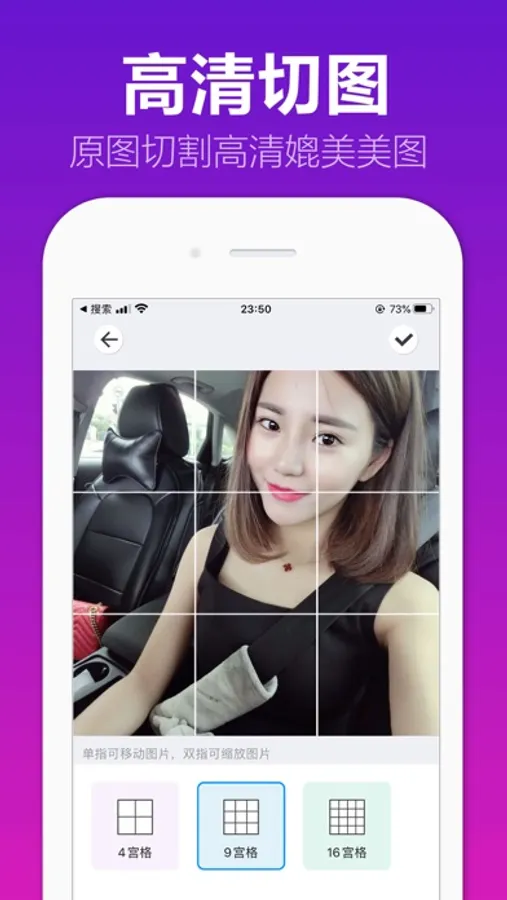 九格切图可以把一张照片切割成9张,通过不规则的组合组成大图,保存到手机相册,可分享到朋友圈、微博等地方。