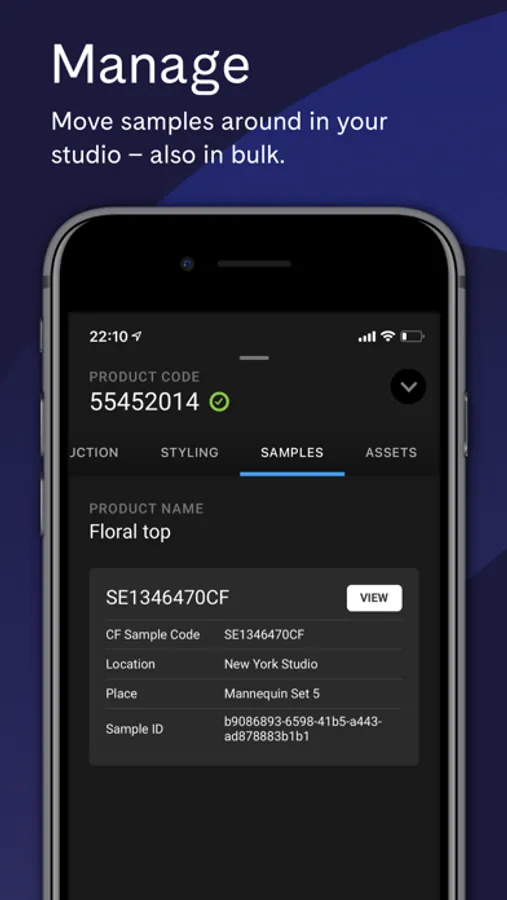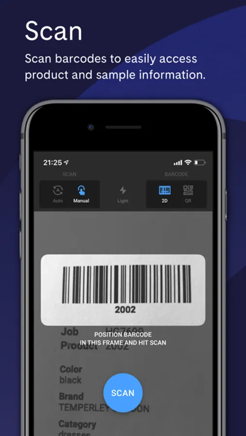 Using the built-in barcode scanner you get instant access to real-time sample and product information like production status, assets, and more. You will be able to update the production requirements, edit properties, change sample location, and much more.