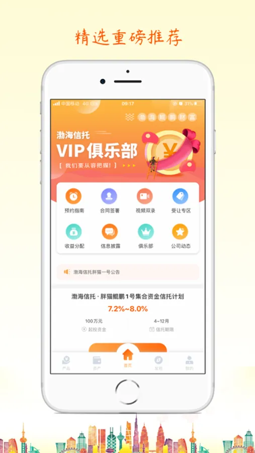 渤海国际信托股份有限公司(以下简称“渤海信托”)成立于1983年12月,前身为河北省国际信托投资有限责任公司。2015年7月,渤海信托完成整体改制,更名为渤海国际信托股份有限公司,注册地为河北省石家庄市,注册资本为36亿元,是河北省唯一一家经营信托业务的非银行金融机构。渤海鲲鹏财富APP是专为高净值客户打造的集产品在线预约、远程双录、电子签约、资产查询等服务的优质在线理财平台。