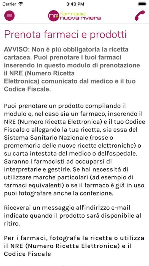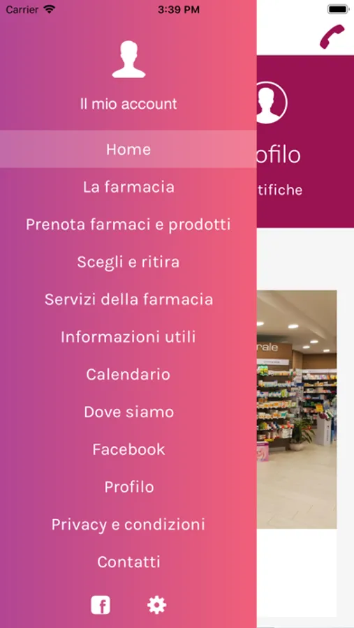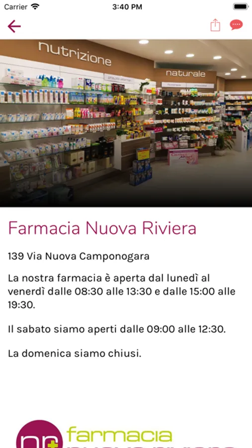 • informazioni della farmacia: descrizione, orari, posizione e mappa, contatti (telefono, email, messenger, facebook, whatsapp)