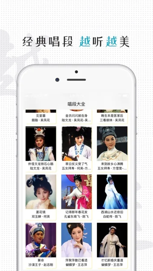 (1)越剧名家经典唱段音乐,配以精美图片和描述和唱词,可以离线下载欣赏,一键设置成手机铃声,分享给微信好友、微信群、朋友圈与大家一起欣赏。