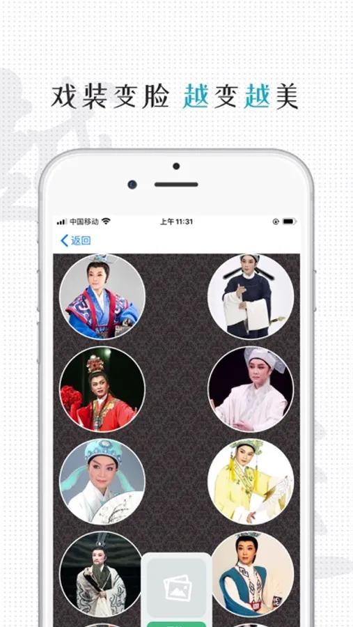 (5)趣味戏装换脸功能,一键 P 图将自己的照片与戏曲名家照片合成,秒变戏中人。一键分享自己的戏装扮相惊艳朋友圈。