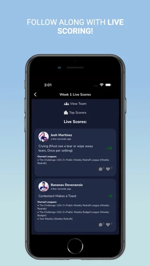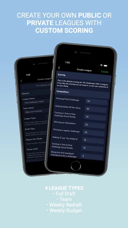 You can create a fantasy league from any of the shows we provide on the app (The Challenge, Survivor, The Bachelor, The Bachelorette, Bachelor in Paradise, The Amazing Race, Big Brother) that are fully customizable. Each show has its own scoring categories that you can use to customize the league to your own liking. Show scores will be updated 24-48 hours after the end of each episode.