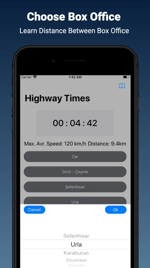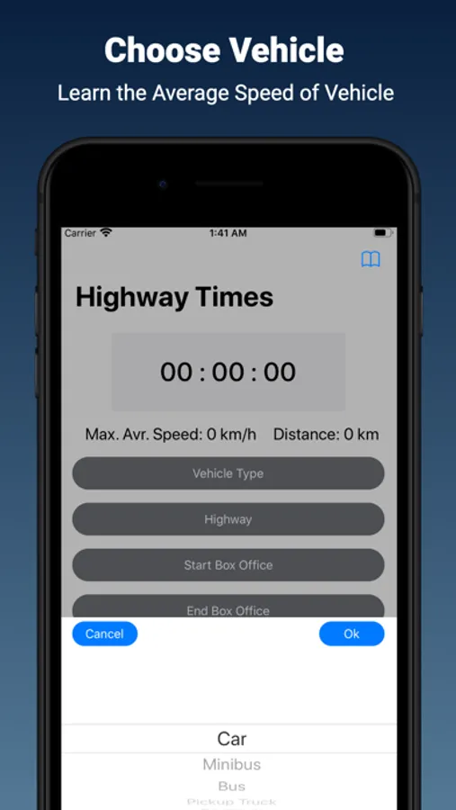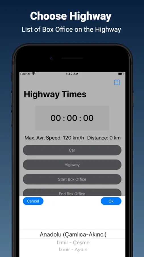 With the selected vehicle type, all the box offices of the selected highway are listed and the distance between the booths and the maximum average speeds of the vehicle are displayed on the screen by selecting the entrance - exit booth.With this information, the minimum time to be completed without a penalty will appear on the screen as a counter. By starting the counter, you can adjust your speed on the journey with the countdown.During your journey, you must follow all traffic rules, not exceed the maximum speed limit for your vehicle and, if necessary, reduce your speed (bridge, tunnel, city, etc.) to the appropriate speed. Since the data presented in the application is for informational purposes only, it does not guarantee that there will be no penalty for you.