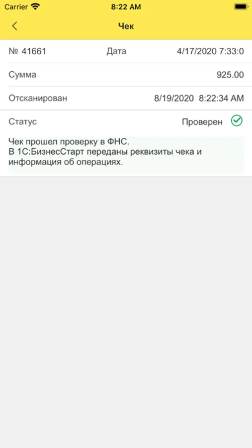 Такой чек автоматически проверяется в ФНС России, а его детальное содержимое становится доступным в сервисе "1С:БизнесСтарт" для автоматического заполнения авансового отчета, путевого листа или документа "Расходы предпринимателя".