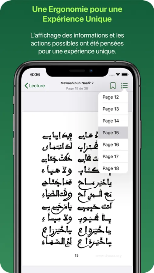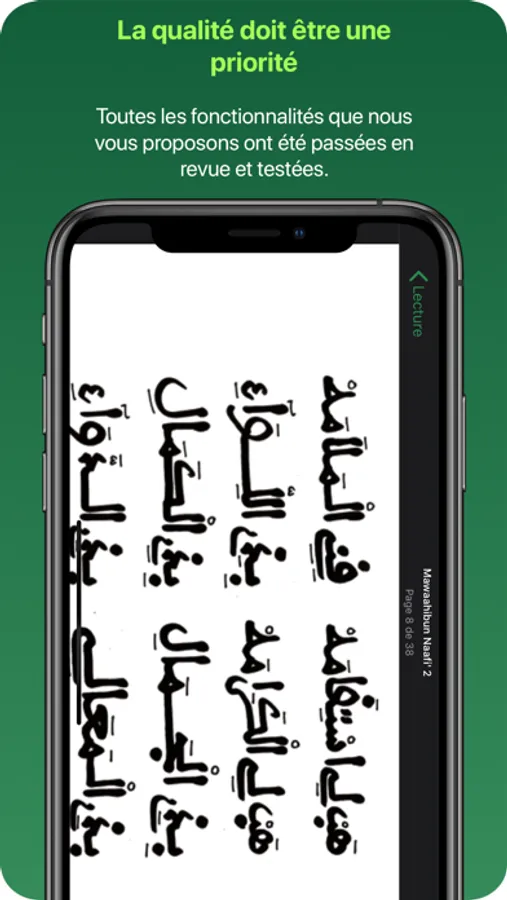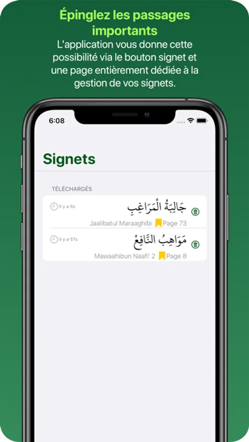 • Ajoutez des pages ou des passages en favoris, que ce soit dans le Coran ou dans une Qasida.