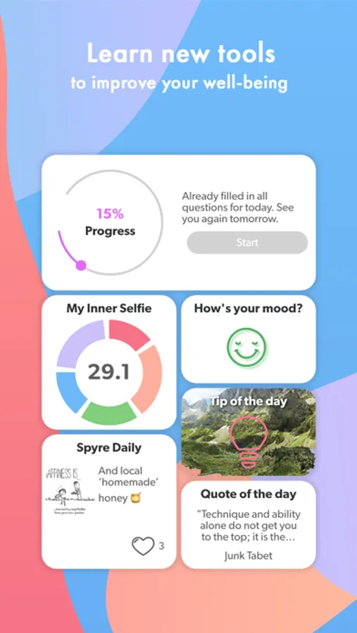 Spyre is your guide to a healthy mind. Start your Spyre journey as soon as you wake up, traveling to school or on your lunch break. Easy tools to keep track of your well-being of the day, the week and beyond. Get to know your inner selfie and start feeling better by the day.