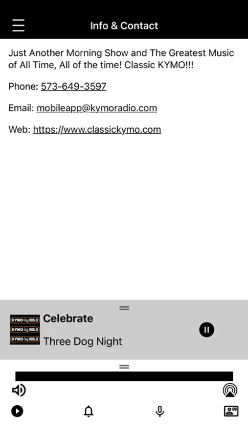Interact with us through the app! Tell your friends and family. Stay in touch with us through the app. Now you have another place to play us and not have to worry about interruptions from TuneIn! Tell all of your friends to get the app today and start connecting with Classic KYMO today!
