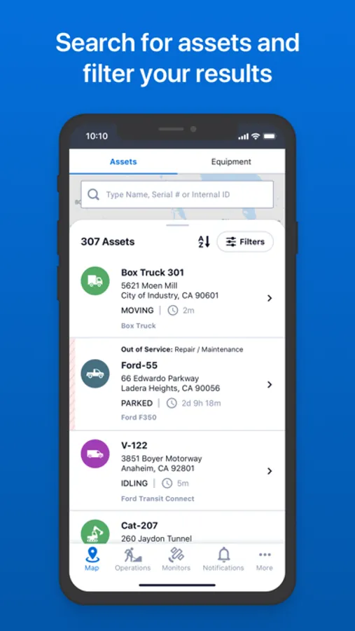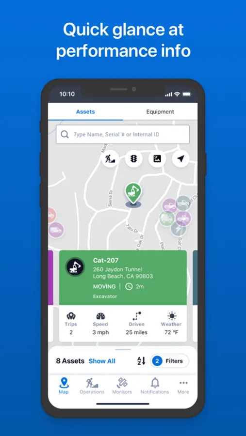 Easily manage construction and heavy equipment including bulldozers, graders, cranes, and loaders.