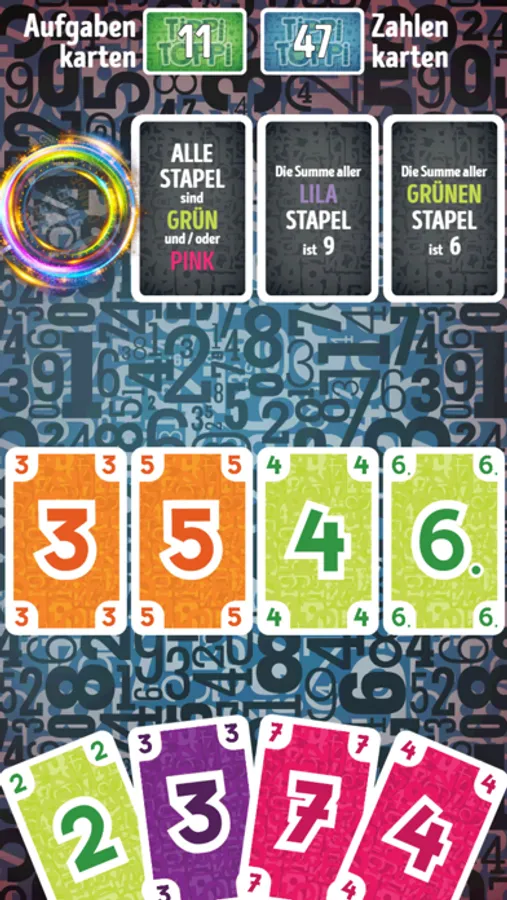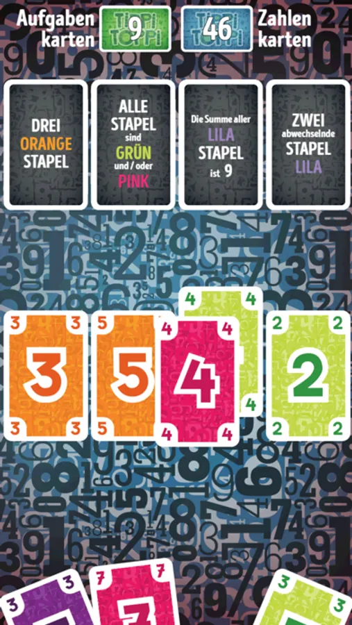 With cards in four colors and with values from 1-7, you have to complete 12, 14 or even 18 targets.