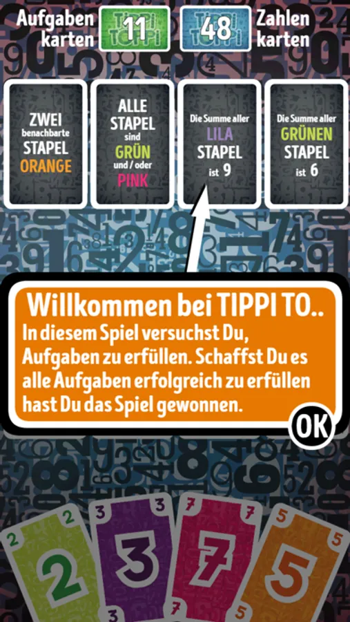 However, this is not as easy as you might think at first sight. You only have 4 cards in your hand at any one time, and there are only 4 of the targets open at any one time. So it can be quite tricky to choose the right card, because the targets have to be fulfilled before the pile of cards with the numbercards is used up.