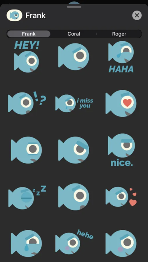 • Switch between Frank, Coral, and Roger using the tab bar above the stickers!