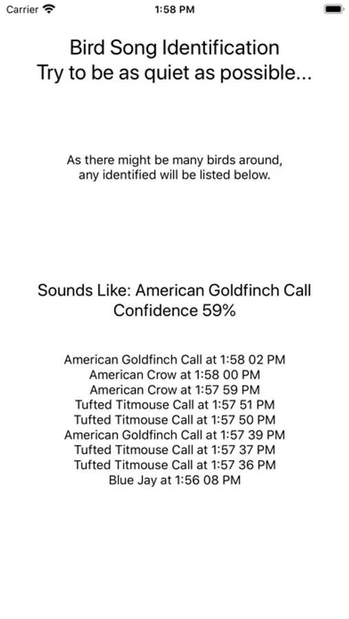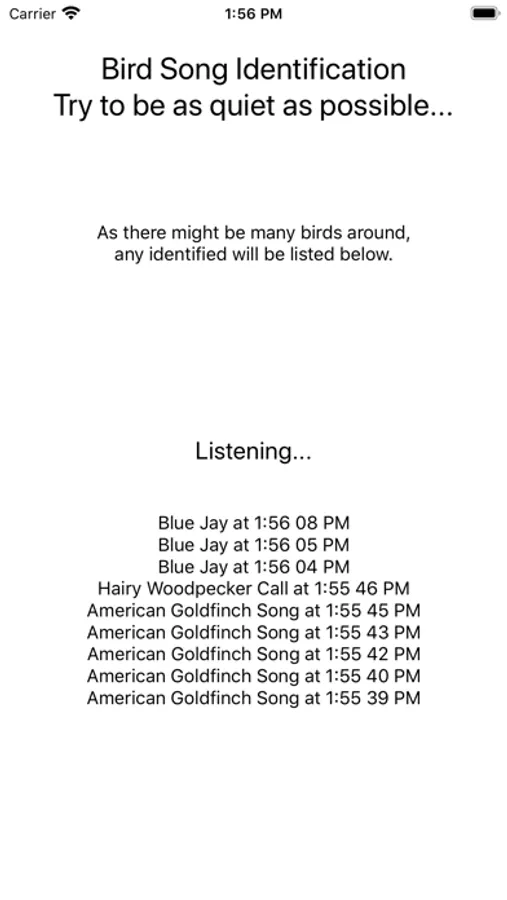 Bird Song ID currently identifies these Birds: