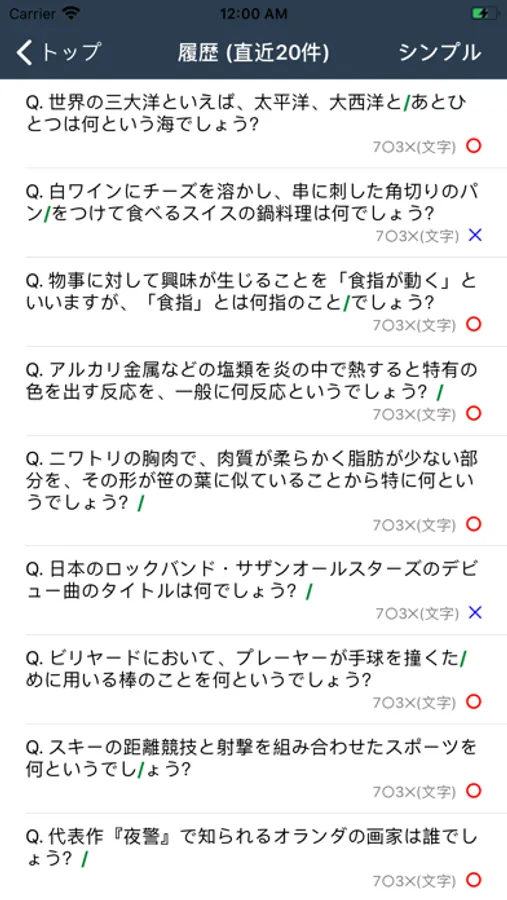 履歴には正誤結果と押したタイミング(スラッシュ)も記録されます。