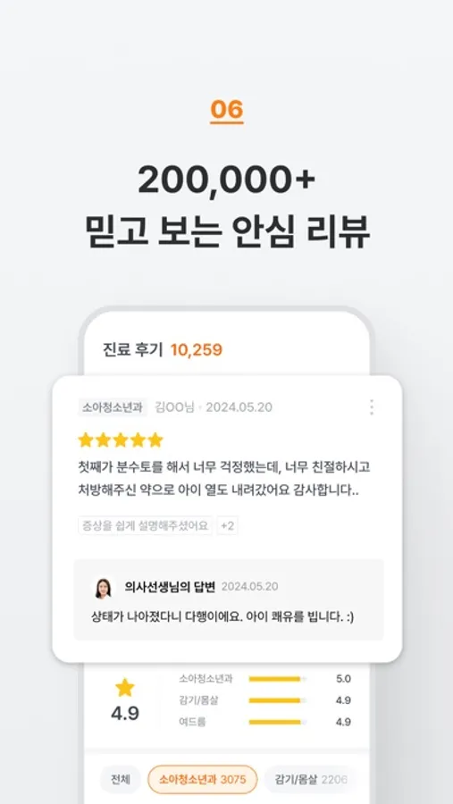 - 25만 개가 넘는 진료 후기와 전문의 여부를 확인해 내가 원하는 의사 선생님에게 진료를 신청할 수 있어요. 소아과부터 산부인과까지 안심하고 진료받아 보세요.