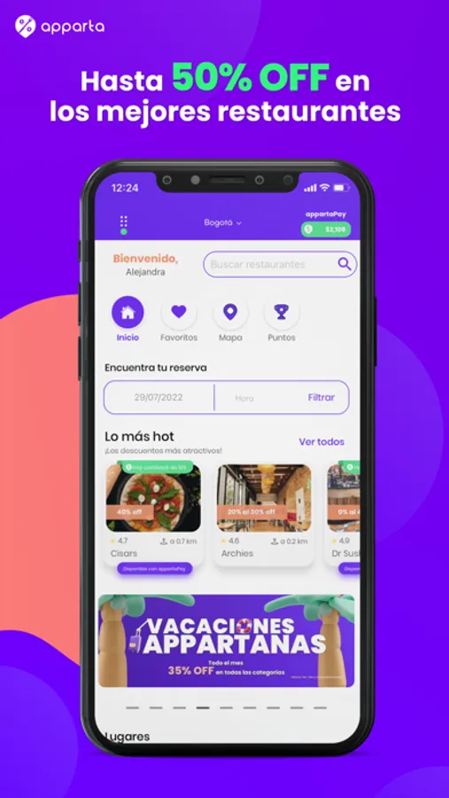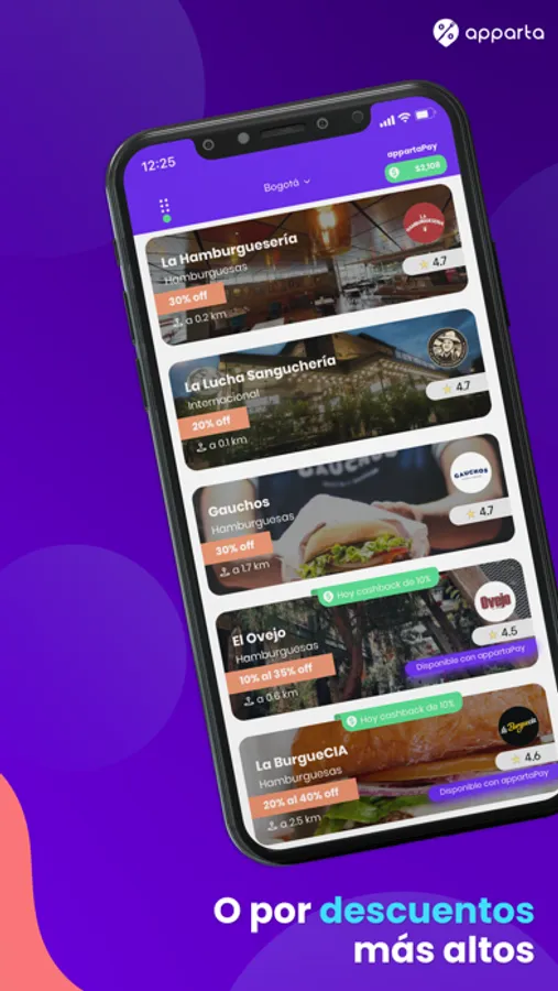 En nuestro Marketplace de restaurantes, ellos te ofrecen un descuento entre el 10% y el 50% para que los visites y adicionalmente nosotros te damos cashback por pagar con AppartaPay en los establecimientos que cuenten con esta opción. ¡Así de transparente!