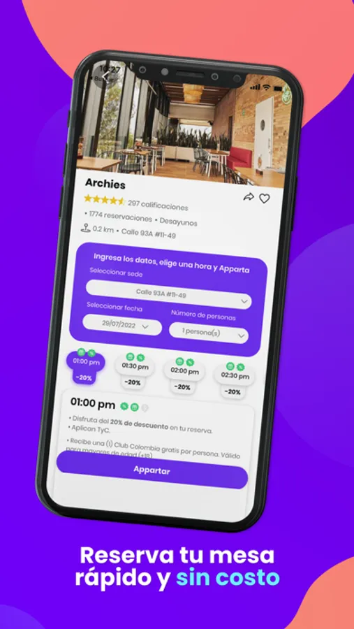 Busca el restaurante y elige la hora, fecha y número de personas que quieres en tu reserva (cada hora puede tener un descuento diferente).