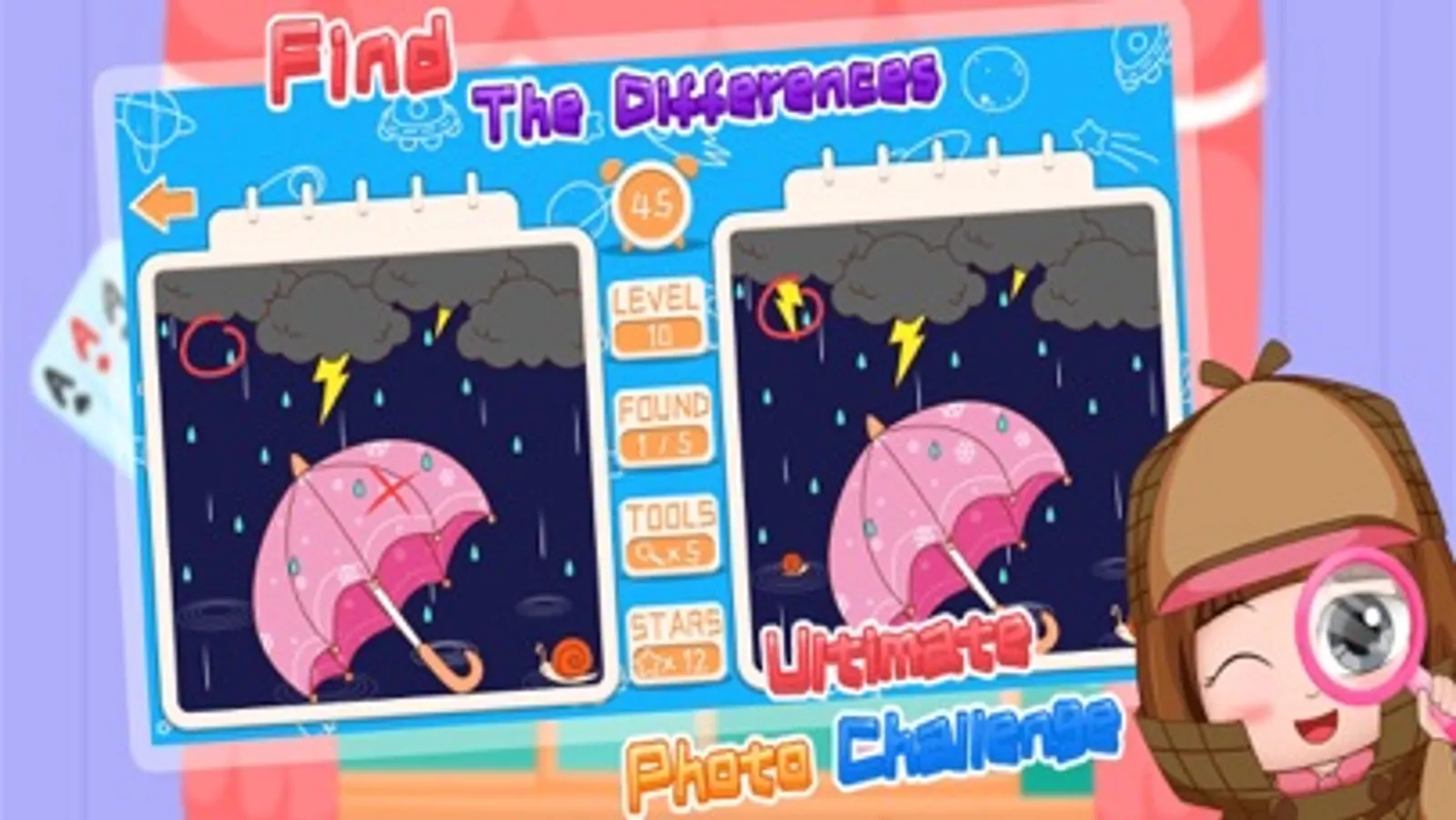 Find differences: the core gameplay of "Find Difference Game", let players find different between two pictures which exercise the brain power and eyesight and also help kids coordinate the hands, brain and eyes ability.