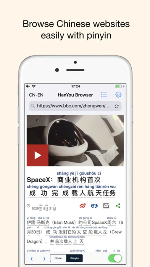 Chinese Browser by HanYou lets Chinese learners and expats browse websites and see pinyin and definitions by tapping on characters