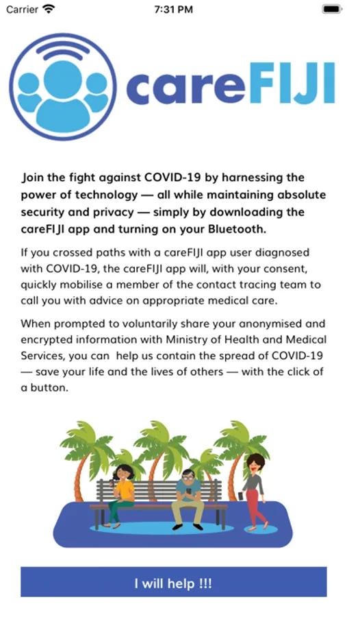 careFIJI is a mobile application developed by the Fijian Government under the digitalFIJI initiative to assist the Ministry of Health and Medical Services streamline and speed up its manual contact tracing efforts. By opting into this voluntary initiative, Fijians can help stop the spread of COVID-19 and save lives by harnessing the power of technology – all while maintaining their absolute security and privacy. Using Bluetooth technology that does not capture any location or GPS information, careFIJI is based on the open source reference implementation of TraceTogether mobile application developed by the Singaporean Government.