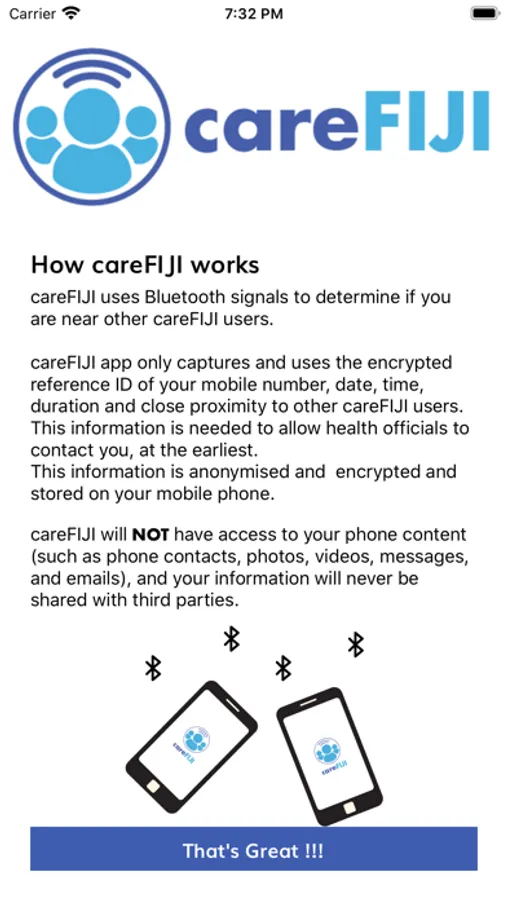 careFIJI uses Bluetooth signals to determine if you are near other careFIJI users. This close contact data is anonymised, encrypted and stored on your mobile phones.