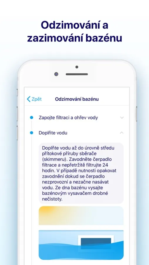 Aplikace bazénového asistenta Vám poradí, jak mít vodu stale čistou a jak řešit případné problémy s vodou ve vašem bazénu. Náš rádce s lehkostí provede jednotlivými úkony ať už se jedná o běžnou údržbu, nebo i vybrané složitější úkony.