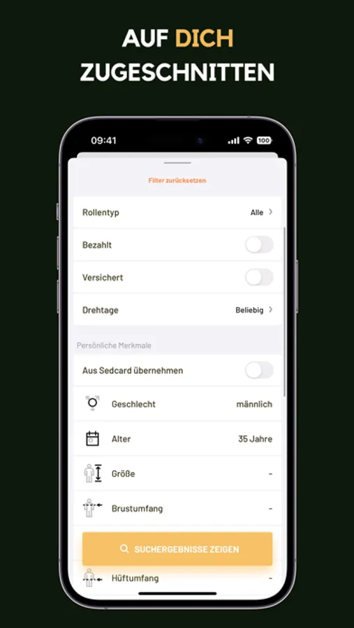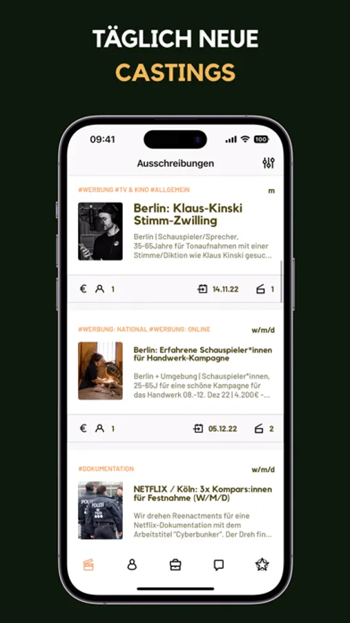 Erstelle in nur wenigen Schritten dein persönliches Profil und sortiere die passenden Stellenangebote nach deinen Wünschen und Vorlieben mit der praktischen Filterfunktion. Die Top-Caster und renommierten Filmproduktionen nutzen selbst ebenfalls die CAST ME App, sodass du mit ihnen direkt in Kontakt treten und dich für interessante Projekte bewerben kannst.