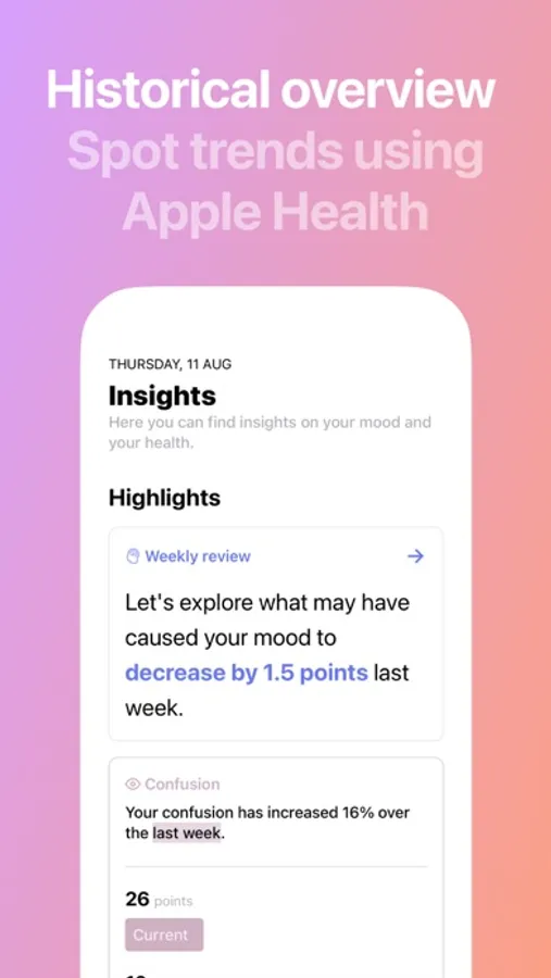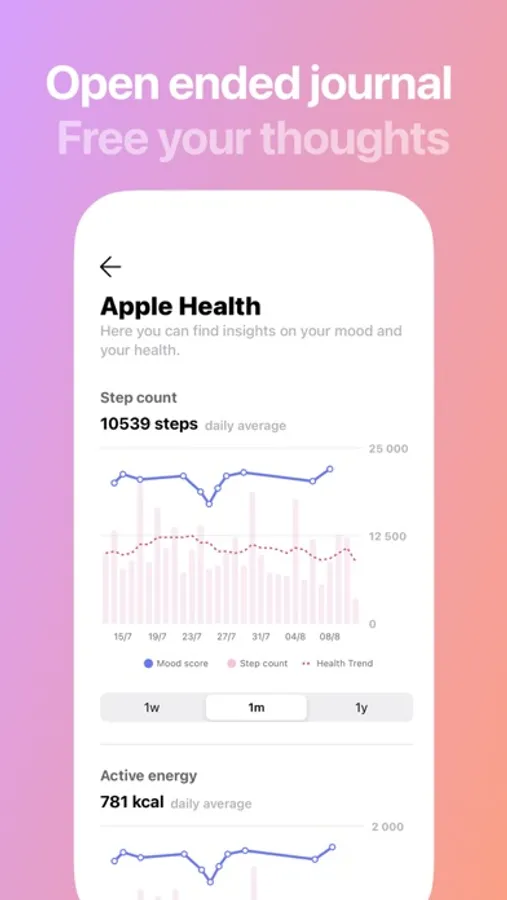 We integrate with Apple Health, allowing you to create an ongoing qualitative catalog of your mental wellbeing alongside your physical wellbeing. Explore how your mood and exercise interact and answer questions like if hitting 10k steps a day make you feel more energetic?
