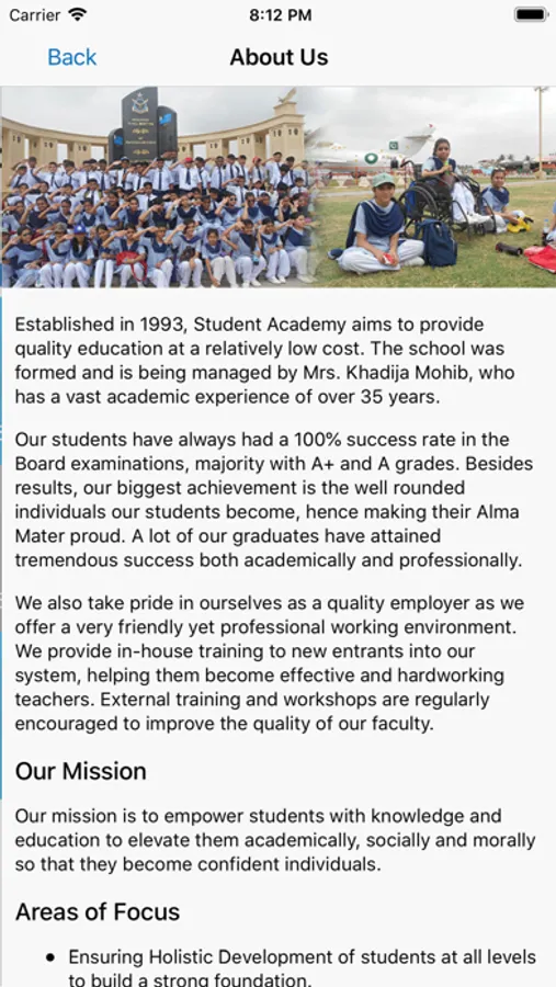 Student Academy established in 1993, Student Academy aims to provide quality education at a relatively low cost. The school was formed and is being managed by Mrs. Khadija Mohib, who has a vast academic experience of over 35 years.