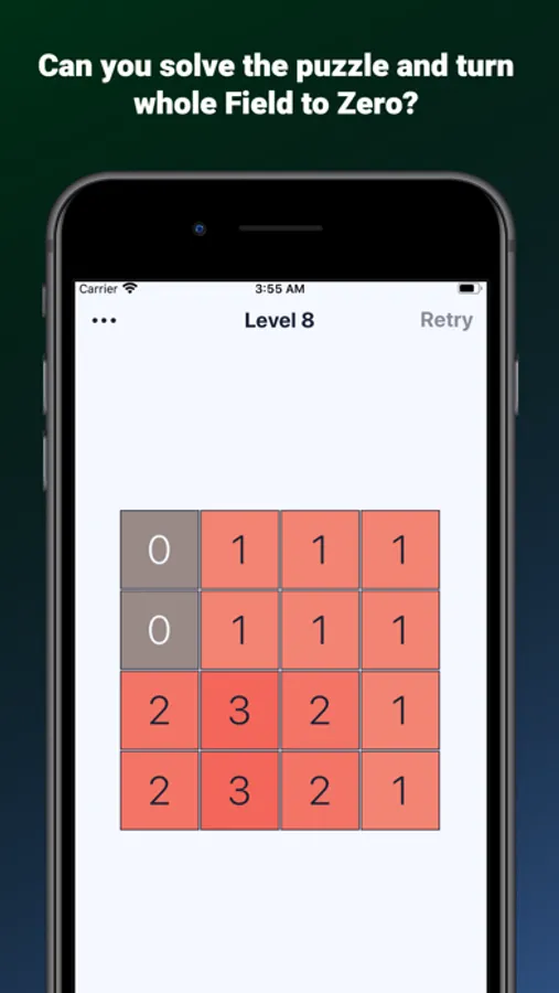 The goal of the game is to make whole grid numbers into zeros. Tapping the cell will decrease surrounding cells numbers for 1. Simple rules but can you handle Level 100?