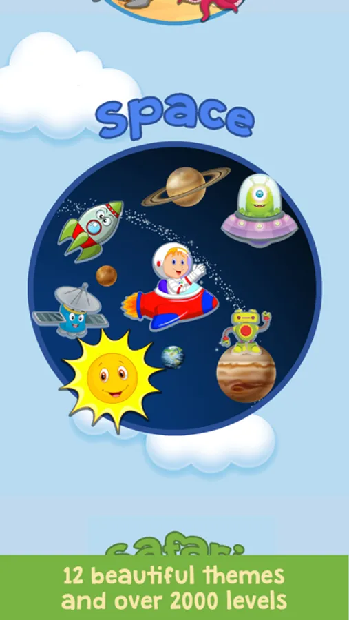 - Space Theme: astronaut, UFO, space rocket, sun, robot and satellite.