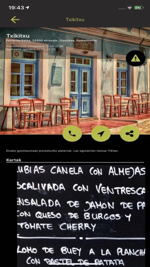 Jangou-ekin inguruko tabernen kartak eskura izango dituzu beti. Bai etxetik janaria eskatzeko baite bertan jateko ere. Kartez gain, kontaktua egiteko modua, eskaintzen dituzten zerbitzuak, jarraitzen dituzten protokoloak... dena aplikazio bakarrarekin modu bateratuan.