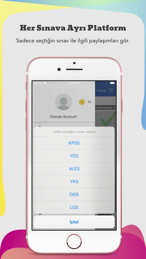 Uygulamamızda her sınav için ayrılan platformlarda, sadece o sınav ile ilgili paylaşılan sorular karşınıza çıkacaktır. Sınava hazırlanan diğer kullanıcılarla takipleşebilir, sınav sürecinde birlikte yol kat edebilirsiniz.