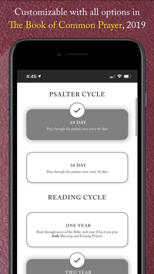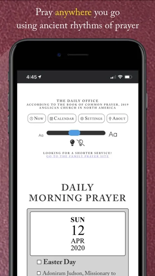 This app invites you to join with Christians around the world in praying with the Church, at any time or in any place you may find yourself. It makes it easy to pray daily morning, midday, evening, and compline (bedtime) prayer without flipping pages, searching for scripture readings or calendars, or interpreting rubrics. The prayers are presented from The Book of Common Prayer (2019) of the Anglican Church in North America and reflect the ancient patterns of daily prayer Christians have used since the earliest days of the church.