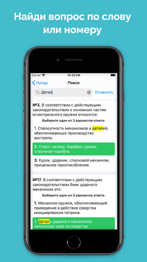 Все вопросы разделены на небольшие списки. Изучай вопросы и тренируйся. Сдавай экзамен из 10 вопросов. Легко находи нужные вопросы через поиск. Добавляй сложные вопросы в избранное.