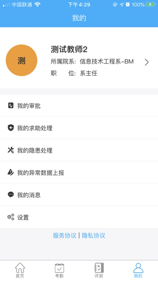 云南省学生安全管理系统教师端主要包括:学生考勤记录、请假审批、求助处理、隐患申报处理、考试批阅、个人中心等功能模块。老师登录app后,可操看操作待办事项(包括请假审批、上报的求助信息、上报的隐患信息等),也可以查看学校安排的各项考勤情况,同时,还可以批阅学生提交的考试情况等。