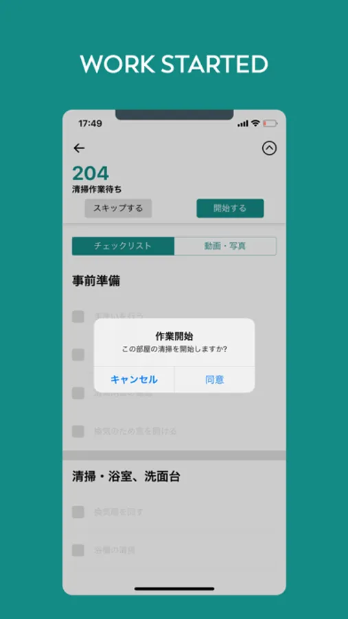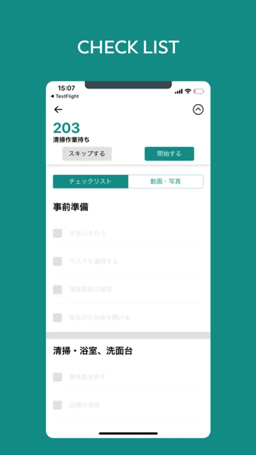 清掃担当者は、アプリ内のチェックリストに基づいて作業を行い、報告を作成します。