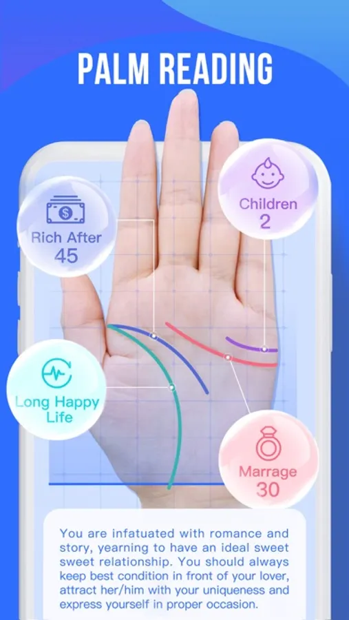 【Palm reading】In real-time with our unique AI and ML algorithms which provides you with a daily fortune analysis of the major lines on your palm.