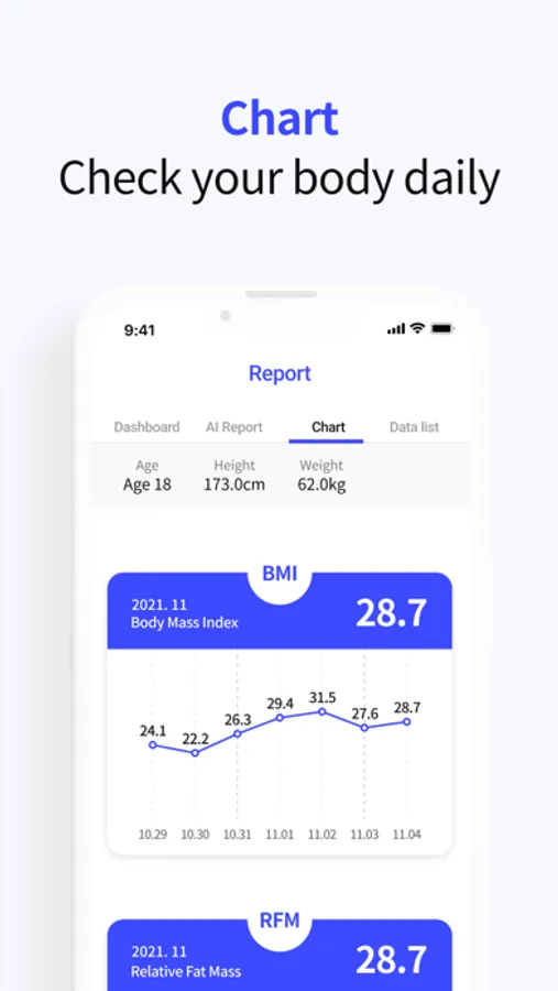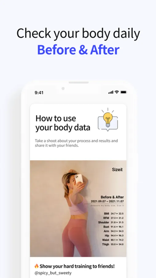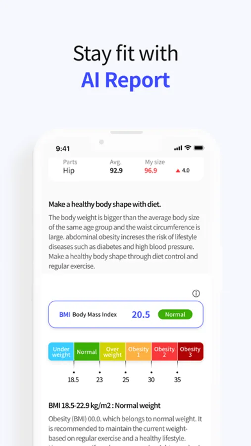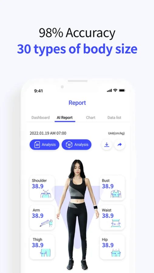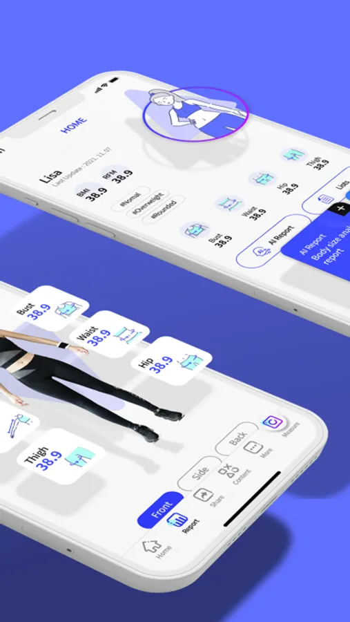 In simple 3 steps, you can measure 30 different parts of your body size. It helps your shopping and exercise.