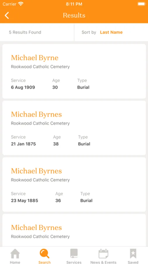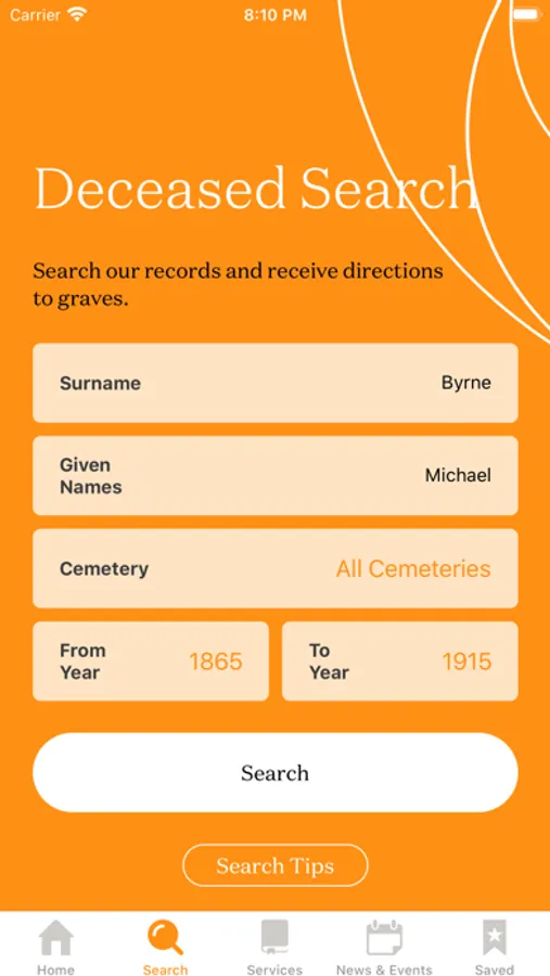 A simple screen allows users to search and find a deceased relative. Once identified, further information about where they are buried, their memorial and directions to the graveside are provided.