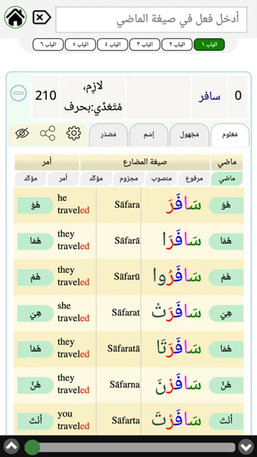 Assiraj offer: Trilateral with all possible conjugation, Quadrilateral conjugation, Active and Passive voices, Perfect, Imperfect tenses, Indicative, Subjunctive, Jussive and Imperative moods, connected object and connected subject conjugation.